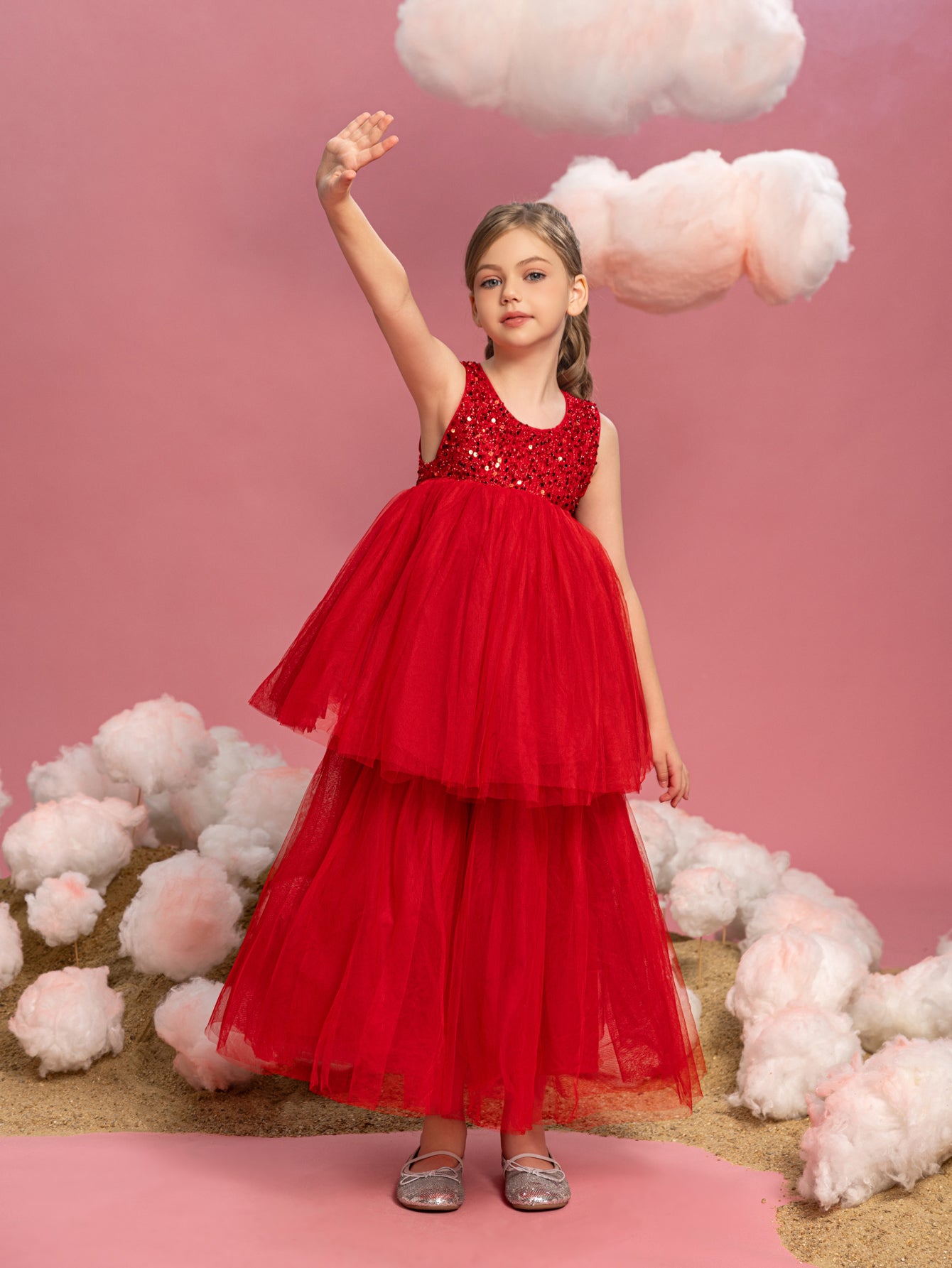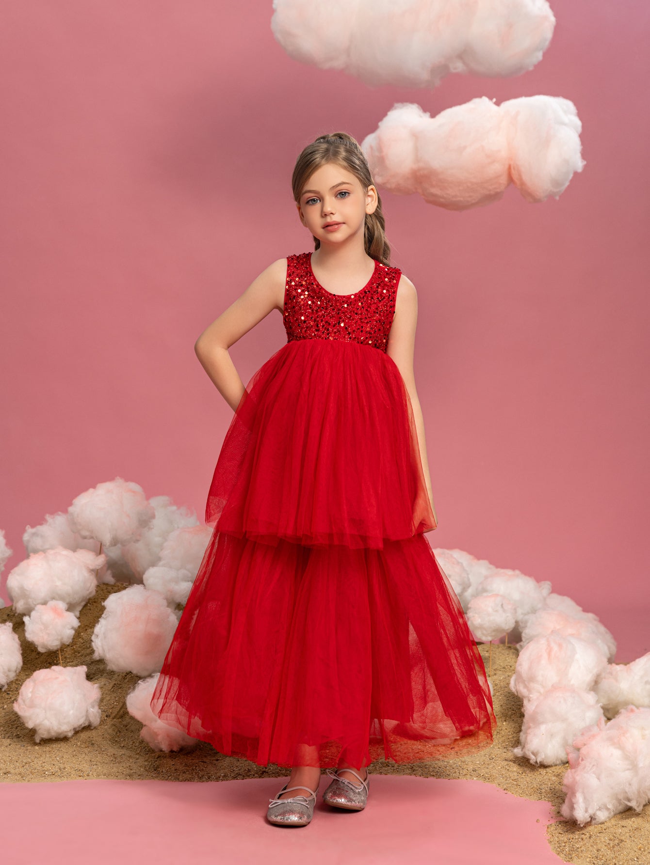 Like a soft cloud gracing the sky, this gown whispers of purity and playfulness. Tiny, colorful sequins sprinkle the bodice, each one catching the light like a droplet of morning dew. Layer upon layer of soft tulle cascades down, creating a voluminous skirt that seems to float around the wearer, conjuring images of a gentle ballet of petals in the spring breeze. It's a dress that speaks to innocent joys and the tender dreams of childhood, a perfect companion for every twirl and leap in the sunlit dance of youth.
