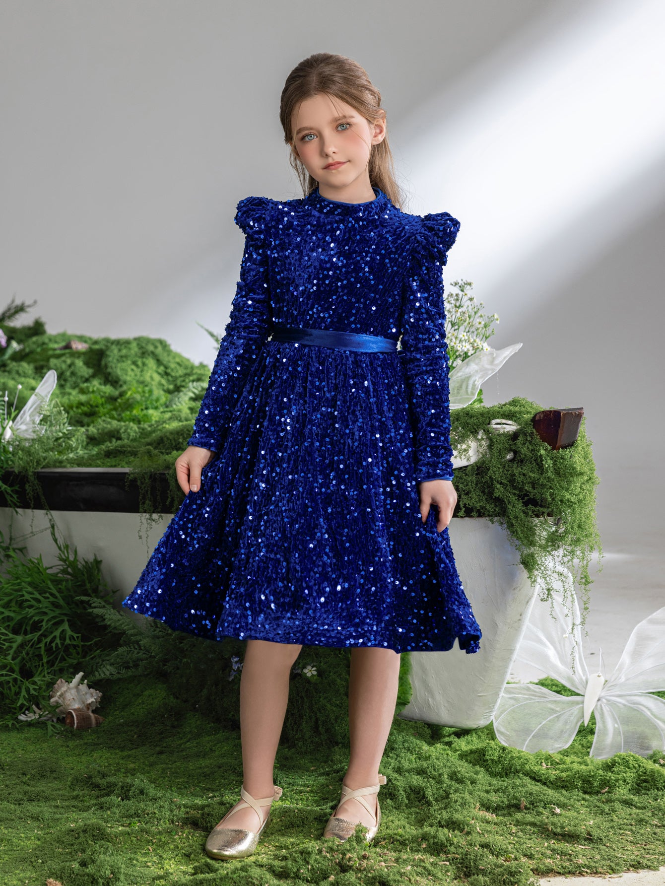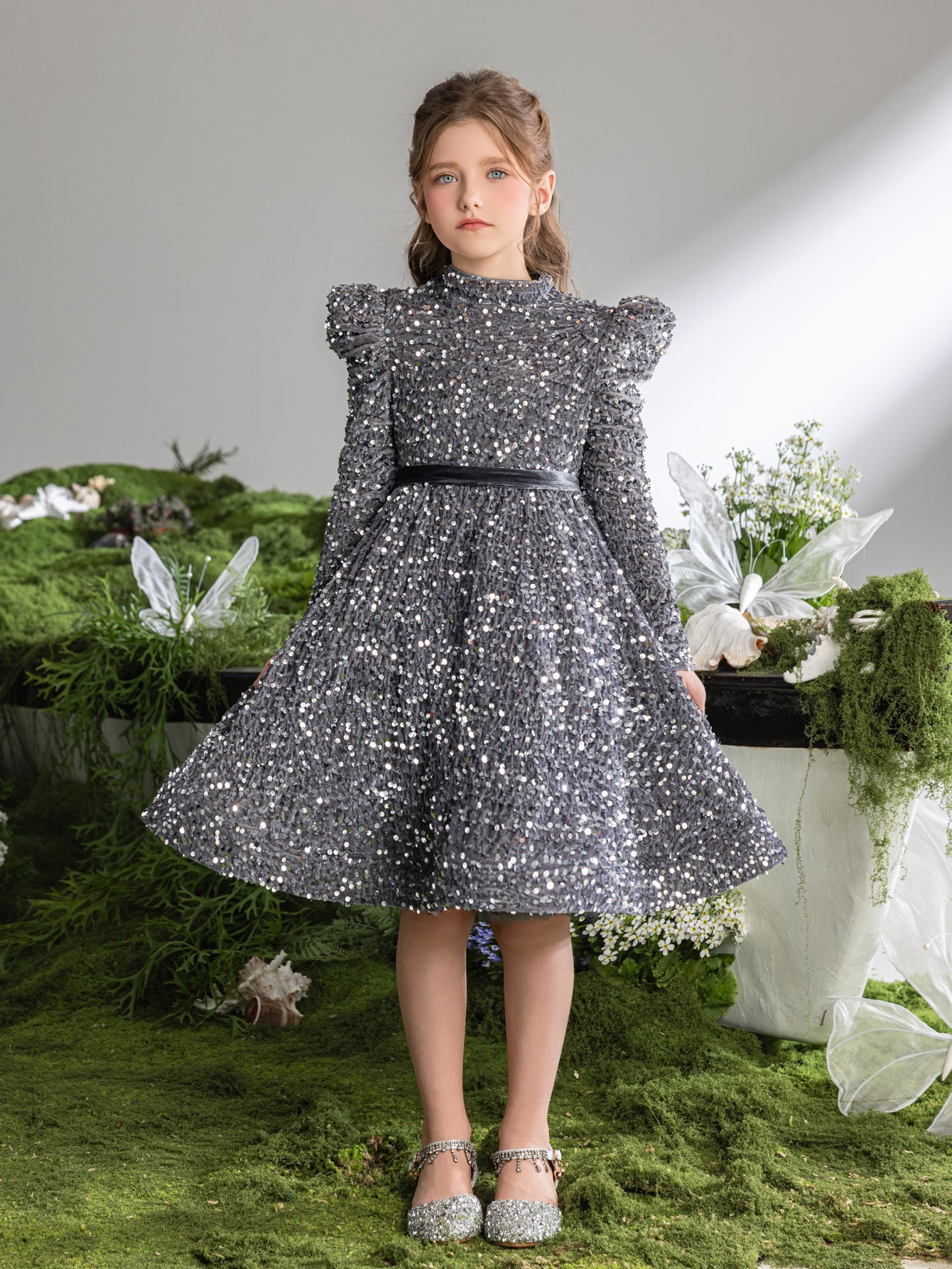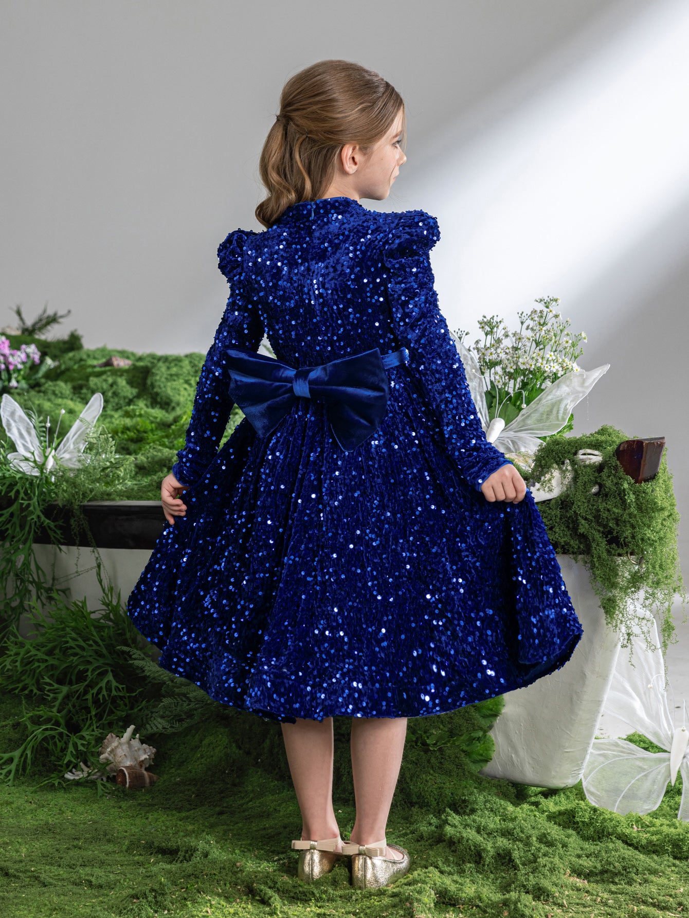 This children's dress is a star-studded wonder, twinkling with a galaxy of sequins. The back of the dress features a charming, oversized velvet bow, adding a touch of whimsy and grace to the shimmering ensemble. With a full, twirl-worthy skirt and cozy long sleeves, it's a dress designed for the most festive of occasions, ensuring the little one feels like the belle of the ball. Perfect for holiday parties, pageants, or any event where a little sparkle is essential.