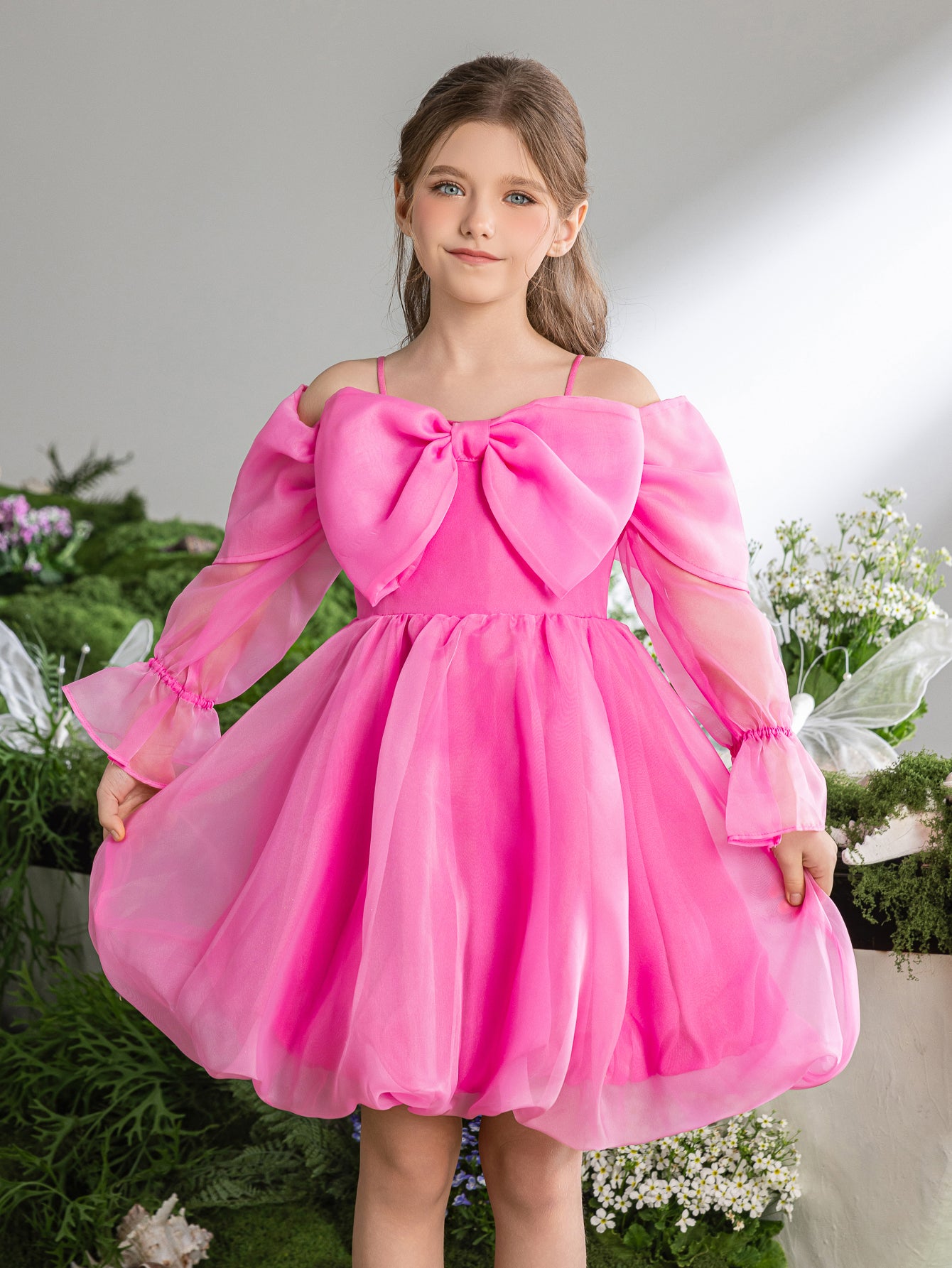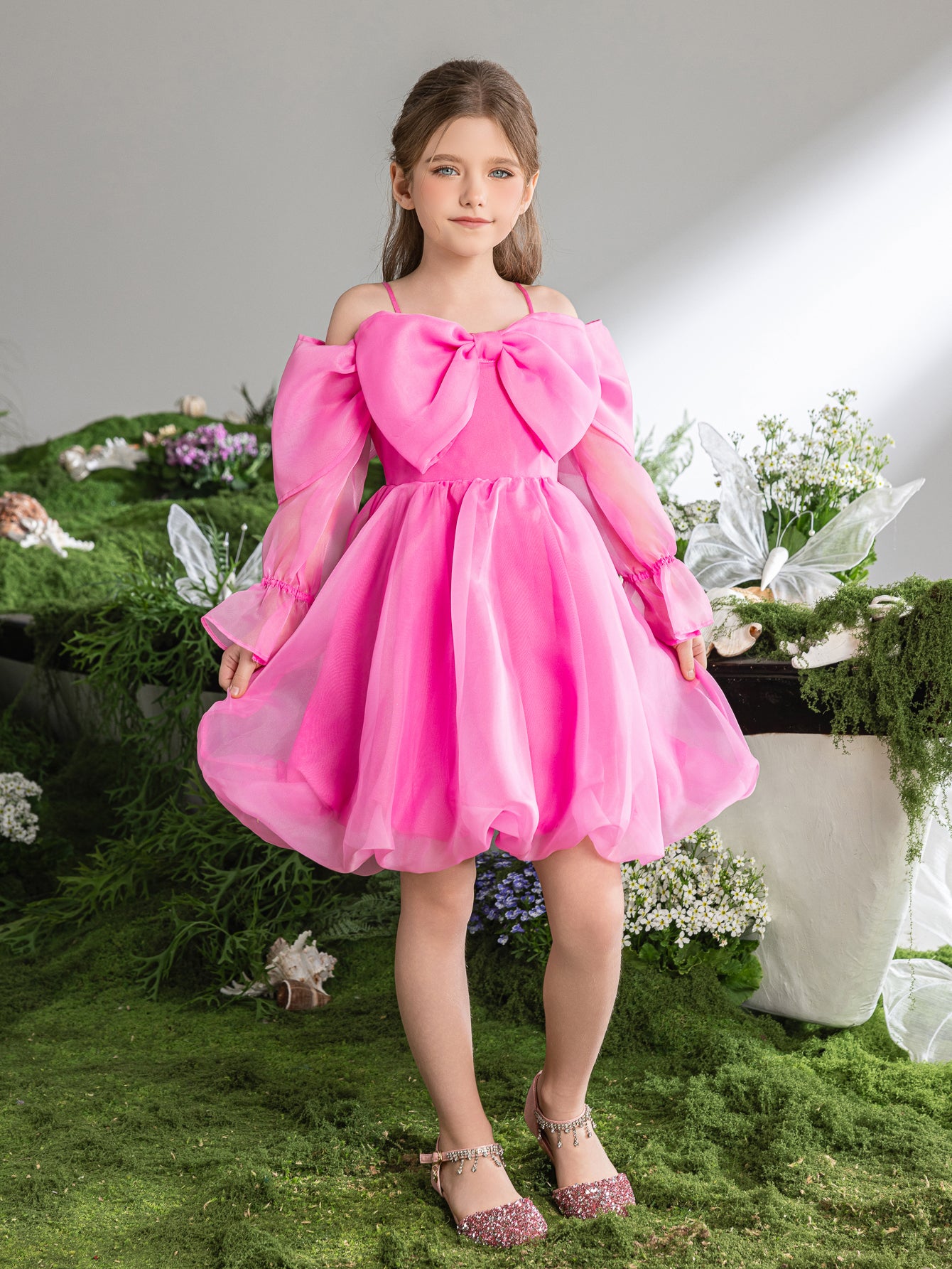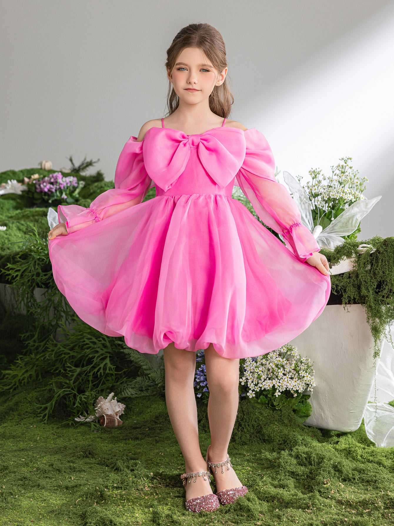 This delightful dress in vibrant pink is like a splash of summer fun. It features a playful bubble hem that adds a pop of personality, while the sheer draped sleeves offer a touch of elegance. The bow detail on the neckline is a sweet focal point, and the overall effect is one of cheerful sophistication. Perfect for birthday parties, holiday gatherings, or any occasion that calls for a bright and festive touch, this dress will ensure she stands out with its bold color and charming design. It's a joyful piece that captures the lively spirit of a young fashionista.