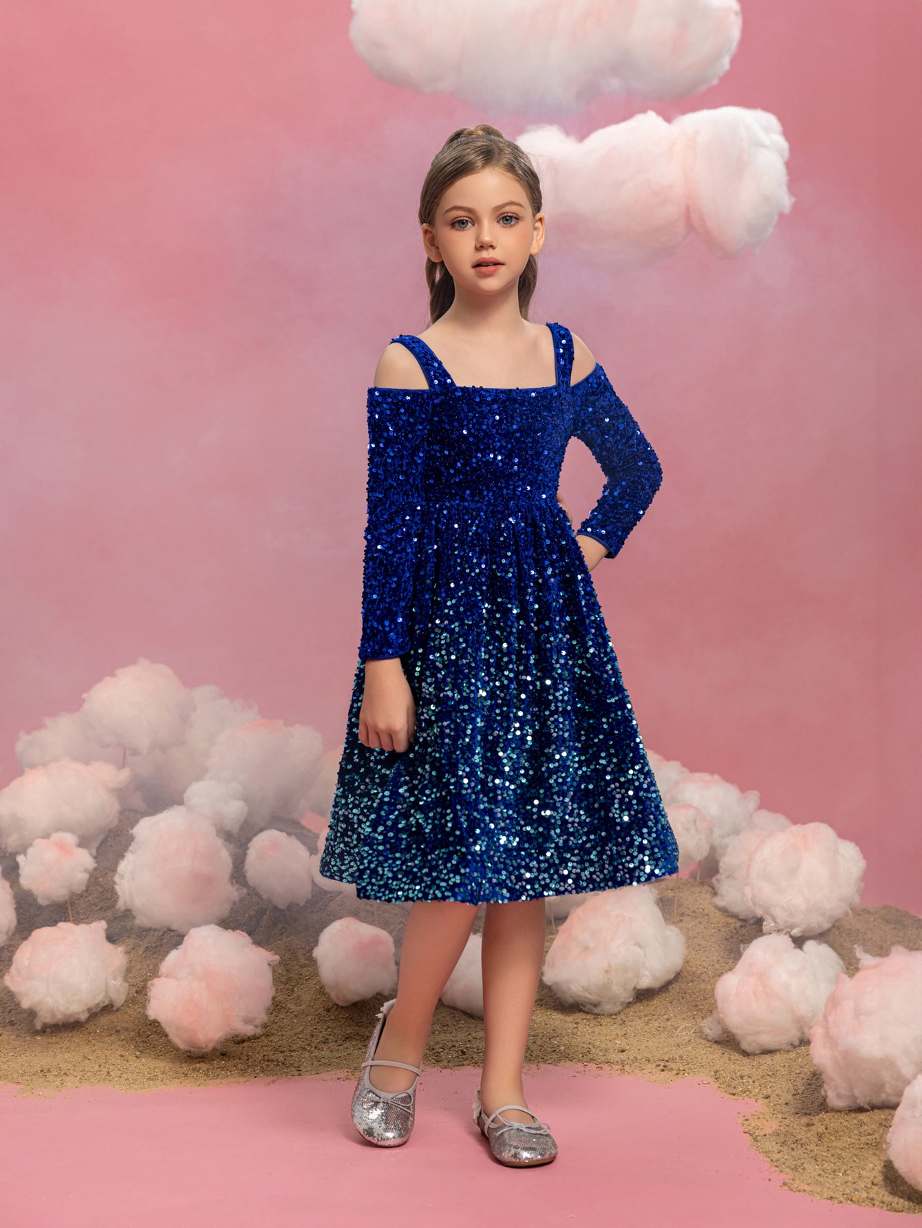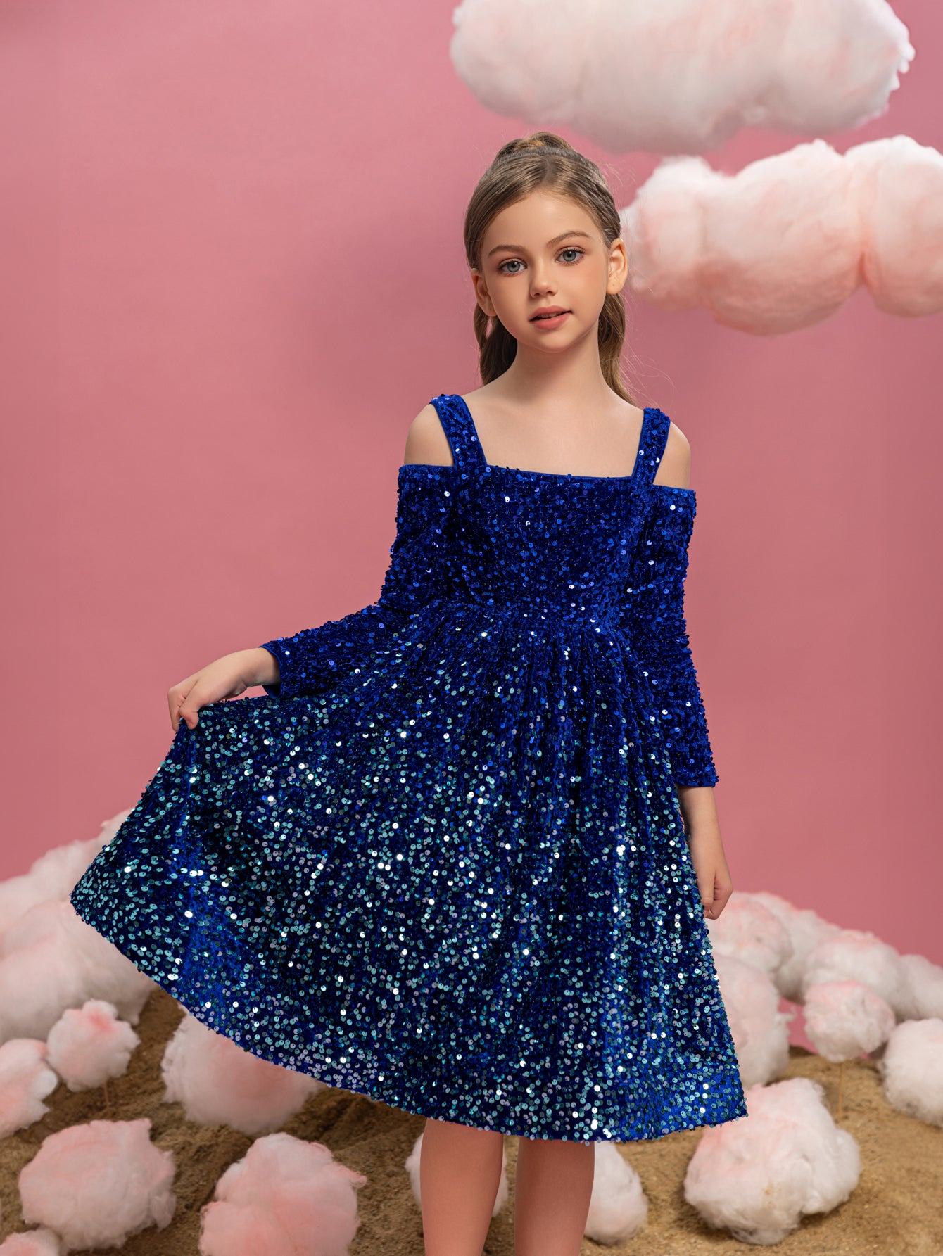 Let your little one shine in this dazzling sequin cold-shoulder dress. This beautiful dress features a unique cold-shoulder design with long sleeves and a square neckline, perfect for adding a touch of modern flair. The entire dress is adorned with shimmering sequins, creating a mesmerizing effect. The fitted bodice flows into a twirl-worthy A-line skirt, ensuring your child feels like a star at any special event. Ideal for parties, holidays, and celebrations, this dress combines style and sparkle.