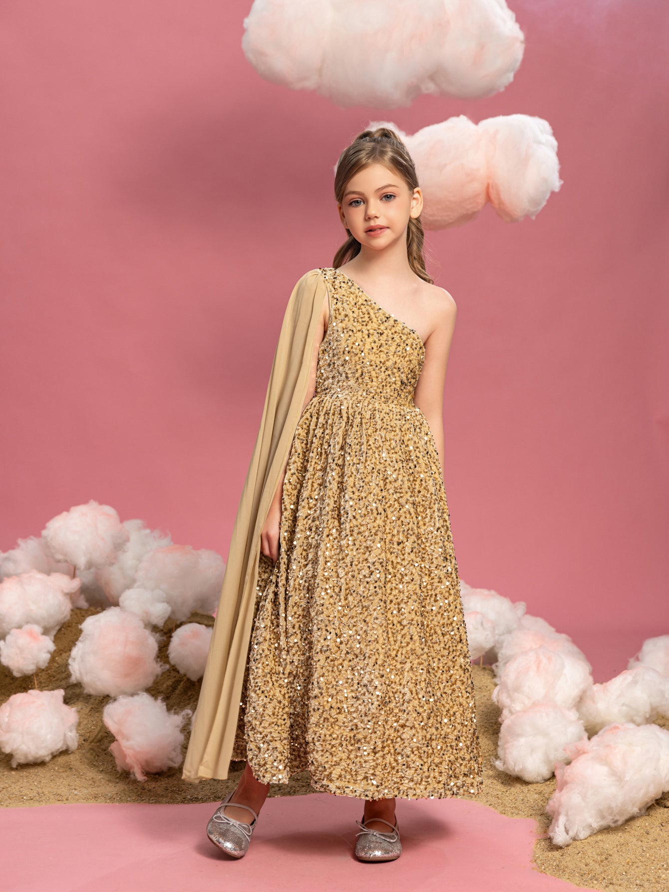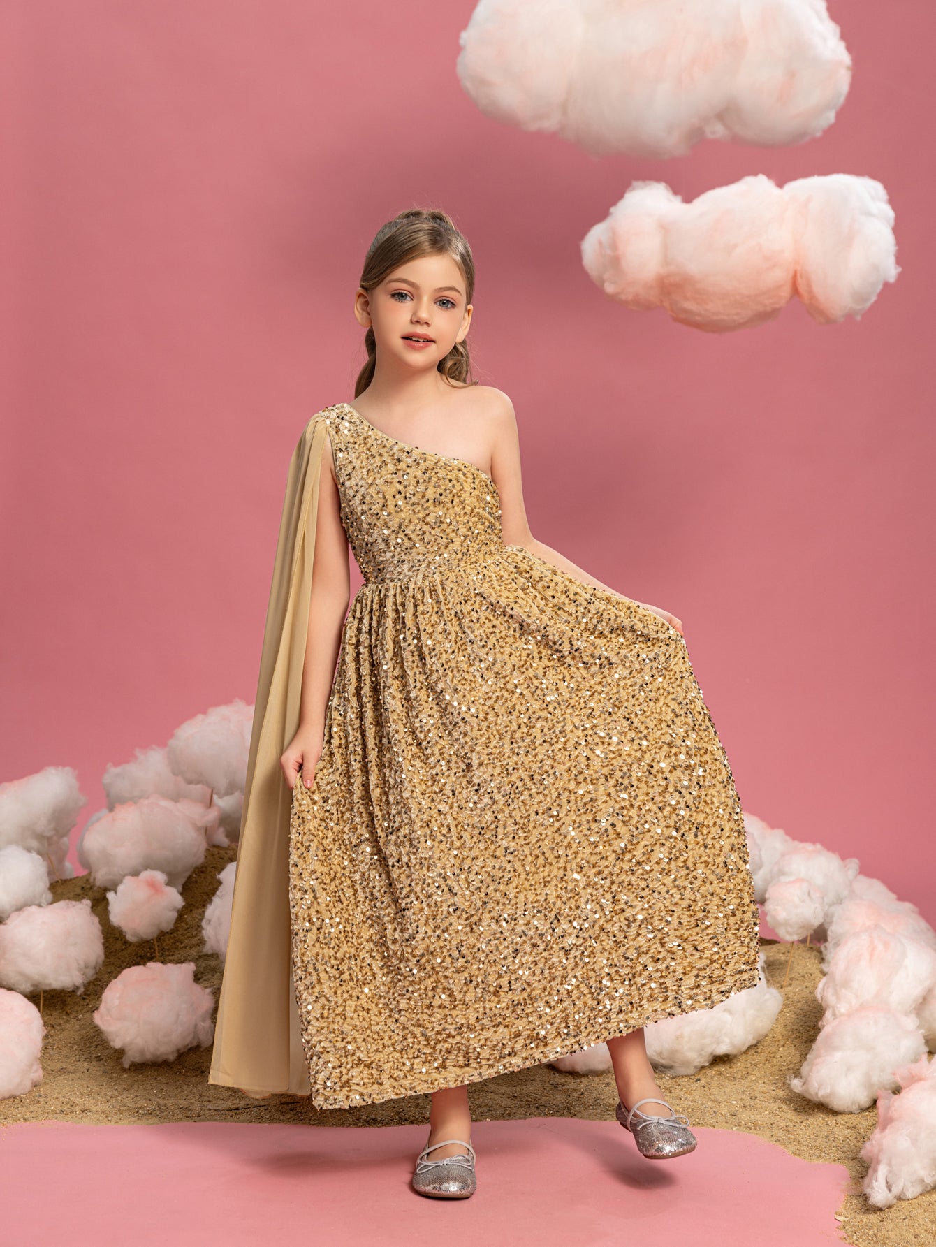 Tween Girls' One Shoulder Draped Side Sequin A Line Dress - Elonnashop
