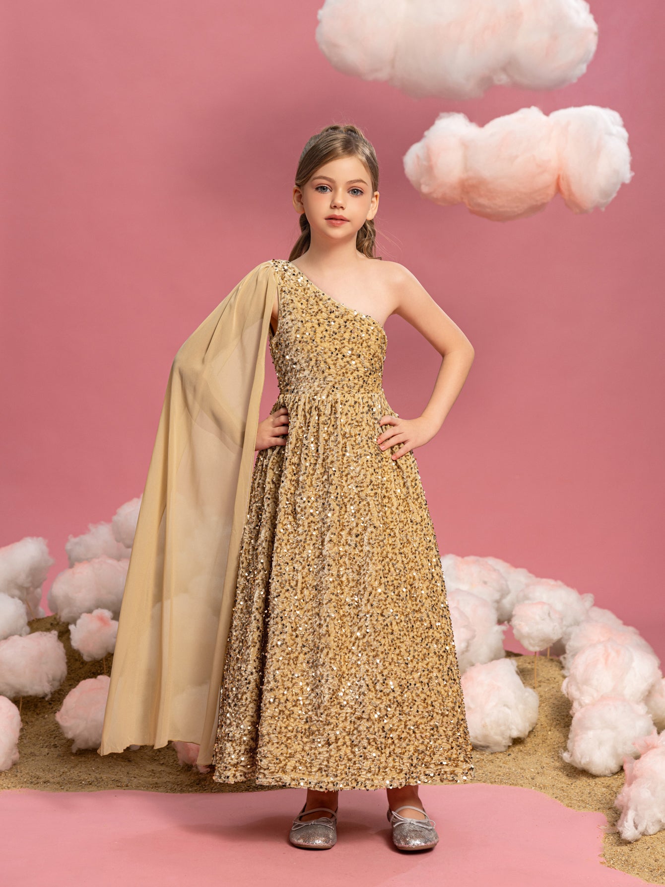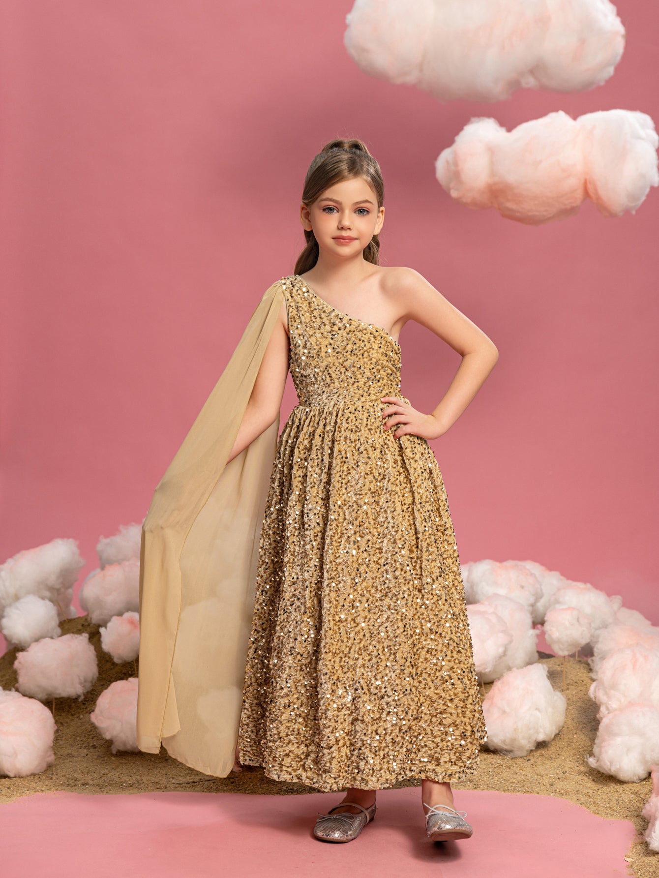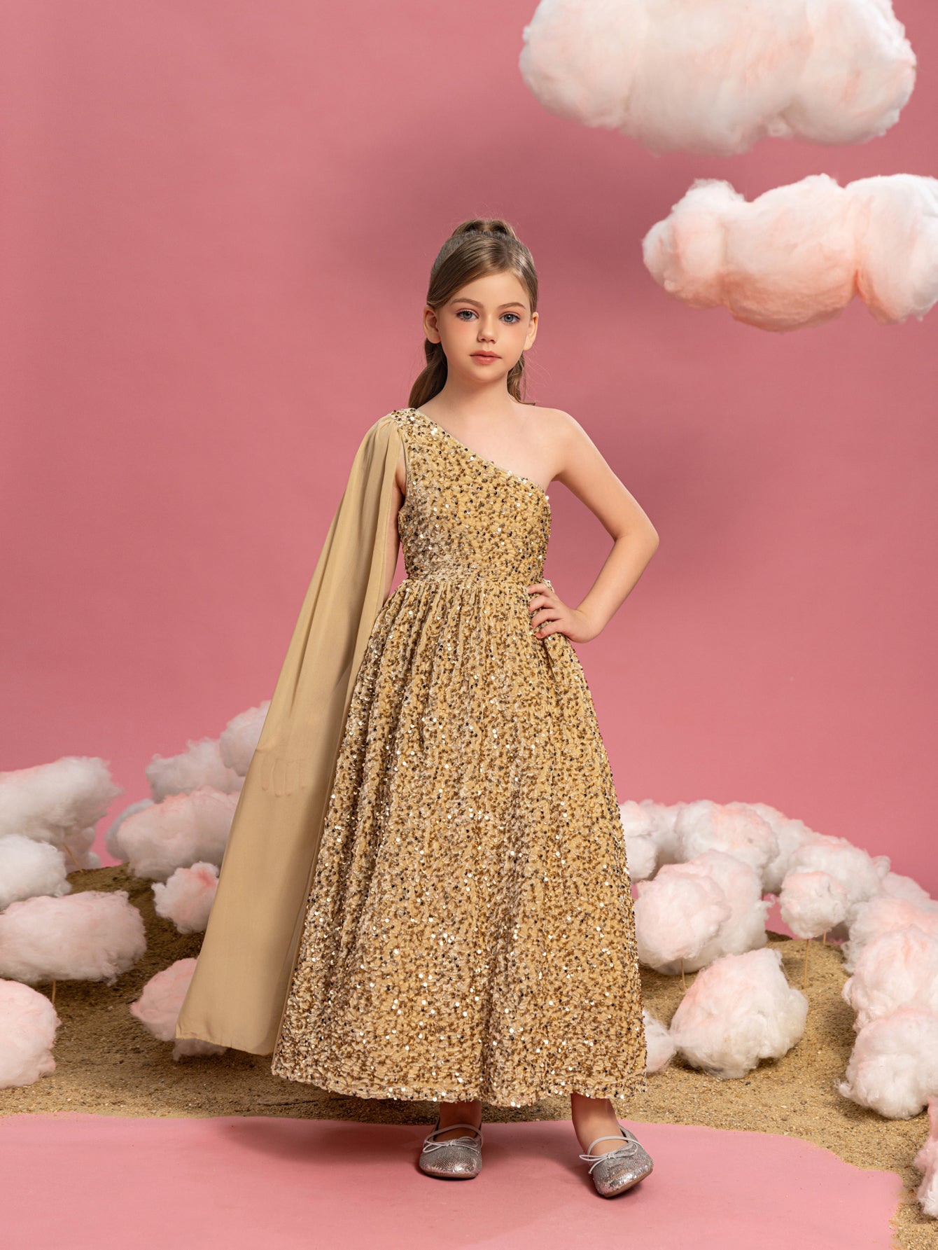 Wrapped in the shimmer of a starry night, this enchanting gown is a dream woven into reality for the young and the spirited. Its sequins twinkle with a subtle playfulness, perfect for moments filled with joyous celebration. The A-line silhouette twirls with a gentle grace, reminiscent of the first joyful dance of spring. A detachable chiffon cape flutters softly like the wings of a butterfly, adding a touch of whimsy. This dress is a canvas of imagination, designed to delight the senses and inspire the stories of tomorrow.