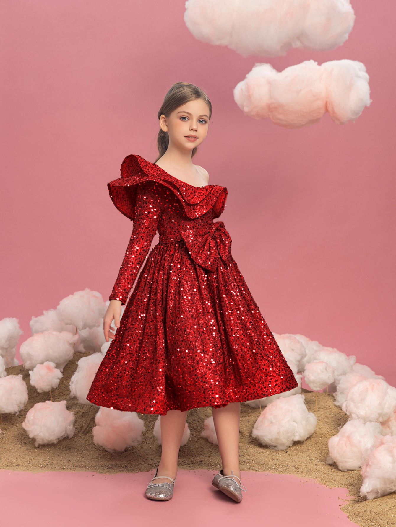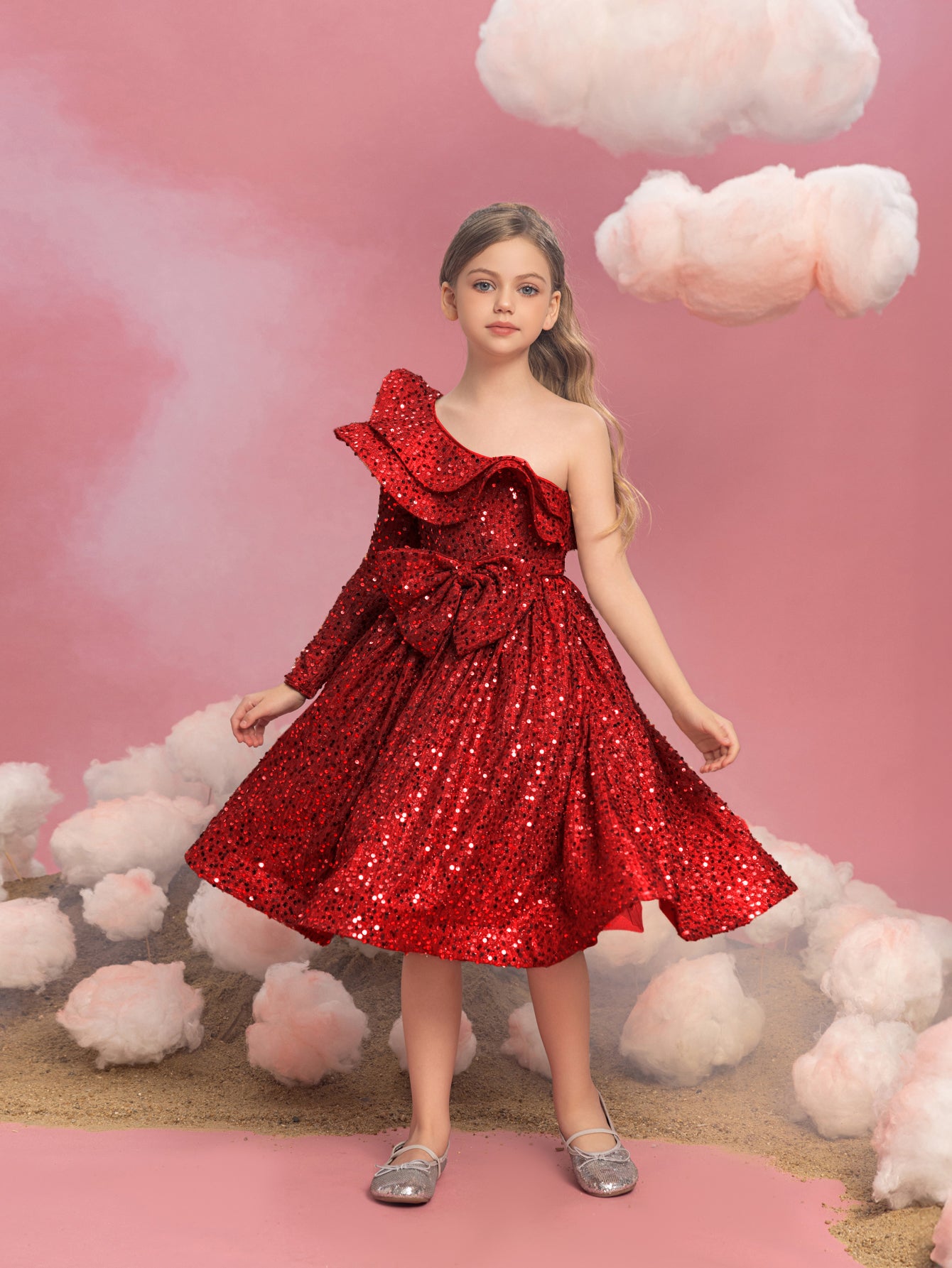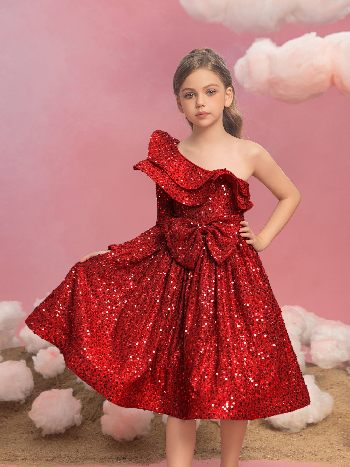Captivate the crowd with this radiant red sequin dress, a spectacular showstopper that's perfect for the festive season. This one-shoulder design features a ruffle that gracefully sweeps across the neckline, offering a modern twist on a classic silhouette. The dress is blanketed in a sea of bright red sequins that shimmer brilliantly, ensuring she shines as the star of any holiday gathering or special event. The A-line cut allows for joyful twirling, and the playful asymmetry of the ruffle adds just the right amount of flair to make a memorable fashion statement. This dress is a treasure for any young lady looking to sparkle and celebrate in style.