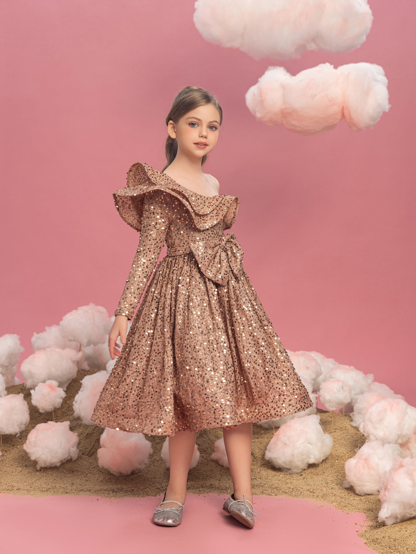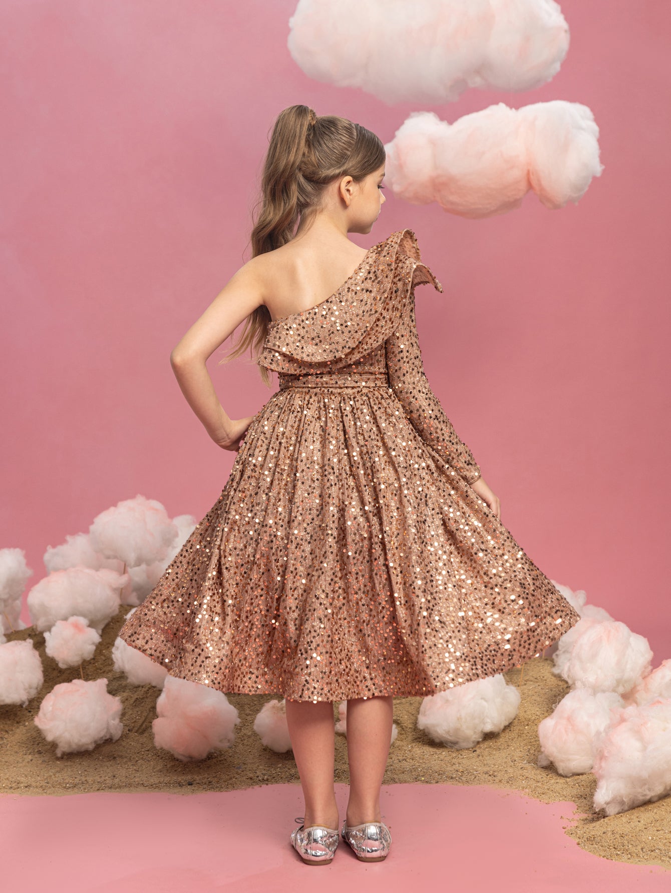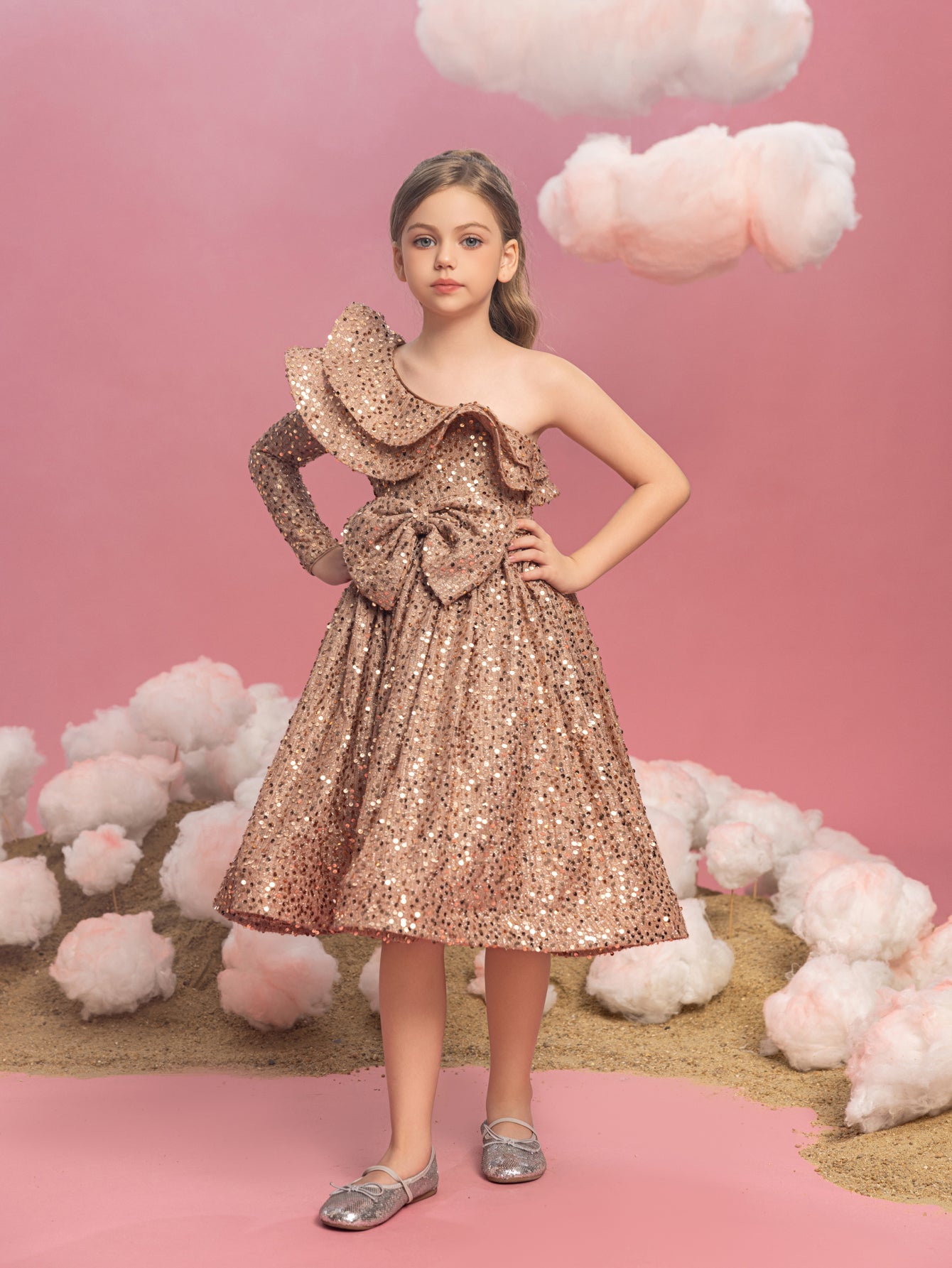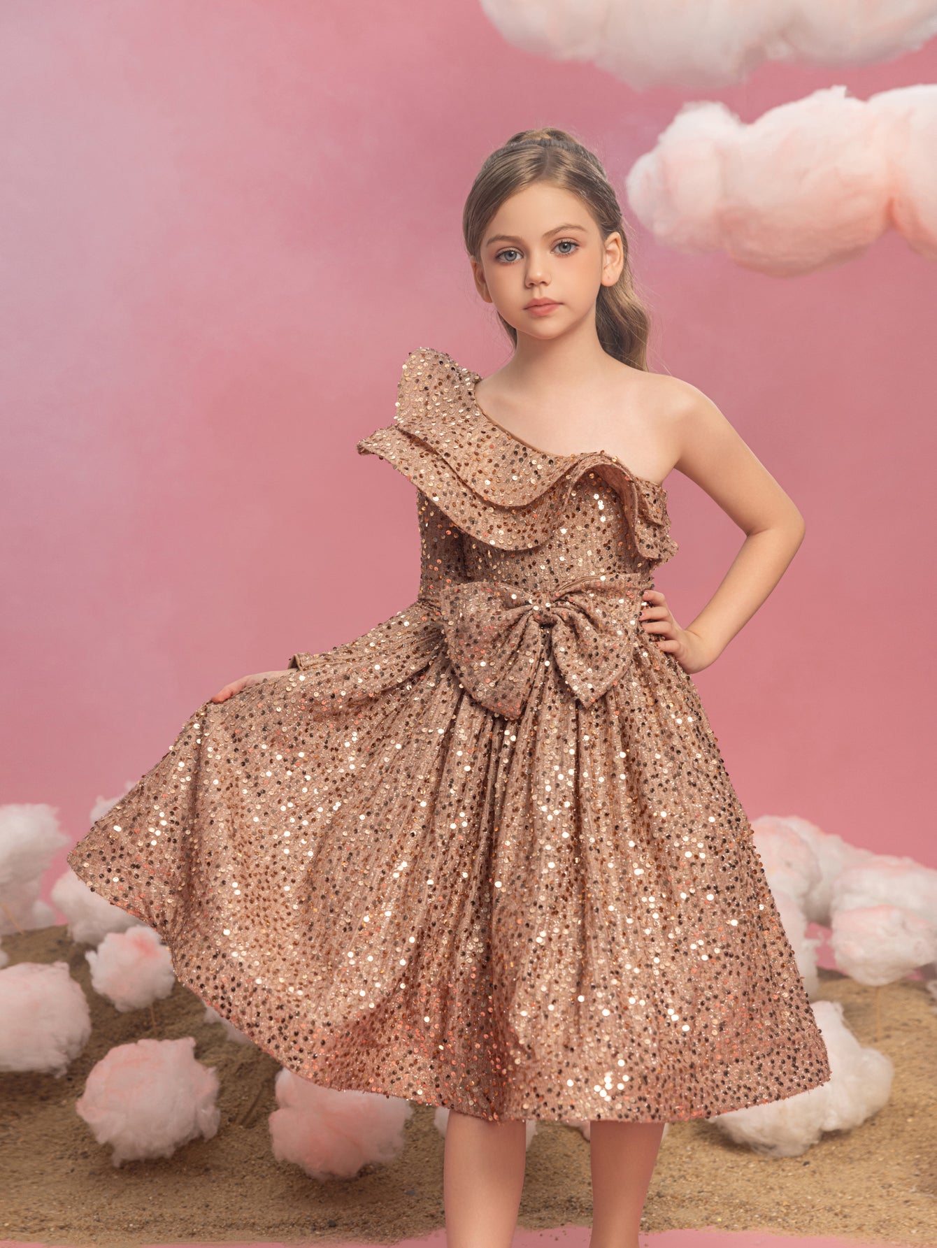 Captivate the crowd with this radiant red sequin dress, a spectacular showstopper that's perfect for the festive season. This one-shoulder design features a ruffle that gracefully sweeps across the neckline, offering a modern twist on a classic silhouette. The dress is blanketed in a sea of bright red sequins that shimmer brilliantly, ensuring she shines as the star of any holiday gathering or special event. The A-line cut allows for joyful twirling, and the playful asymmetry of the ruffle adds just the right amount of flair to make a memorable fashion statement. This dress is a treasure for any young lady looking to sparkle and celebrate in style.