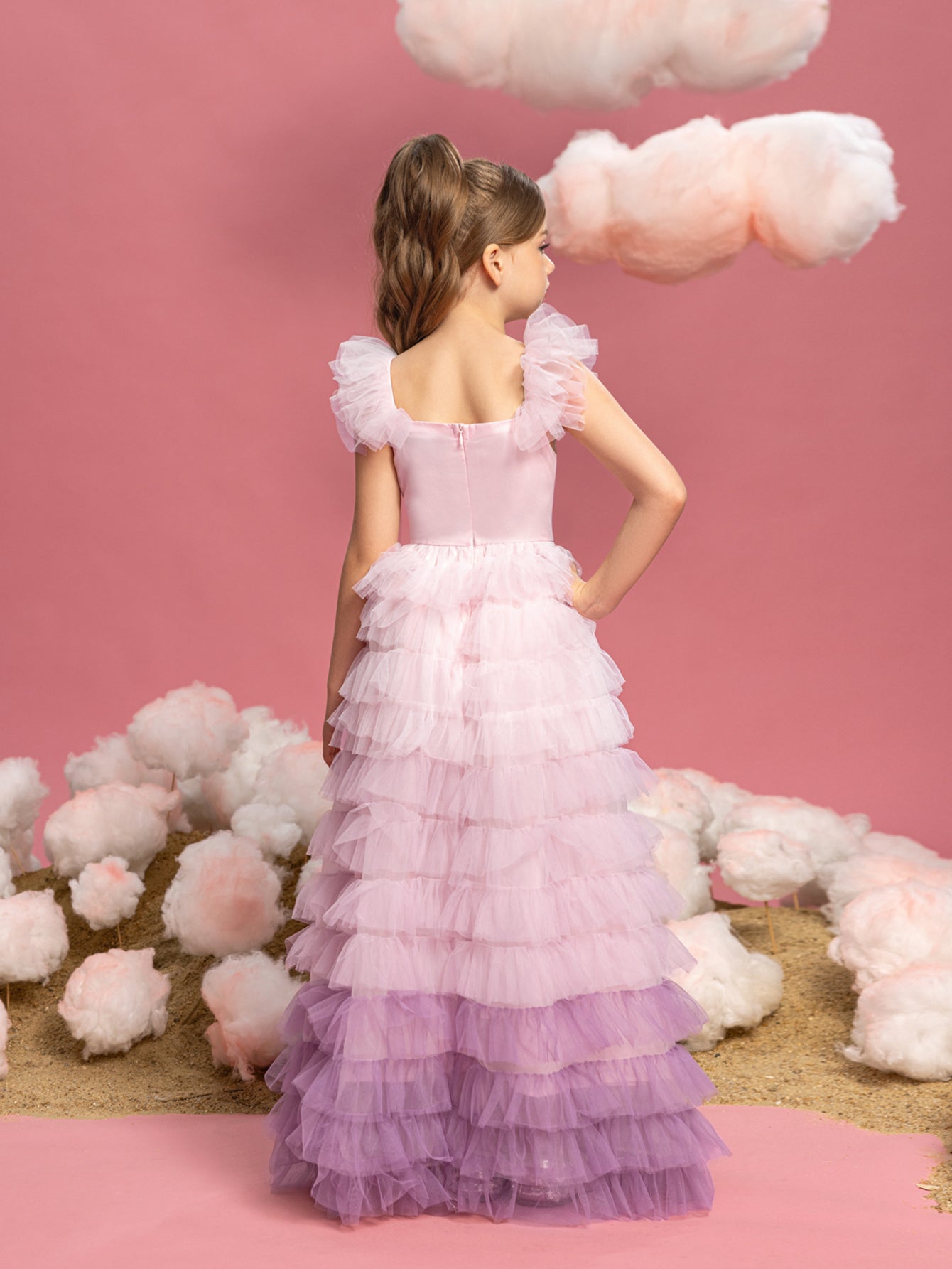 This is a gown that celebrates the splendor of a blush sunset with its gradient of delicate pink ruffles cascading down the length of the dress. Each tier is a soft wave of tulle, creating a texture as rich and playful as cotton candy clouds. The shoulder ruffles add a touch of sophistication, mimicking the gentle petals of a blooming flower. This dress, full of movement and grace, is designed for memorable entrances and joyful celebrations. It’s perfect for a pageant, a milestone birthday party, or any event where the aim is to dazzle and enchant.