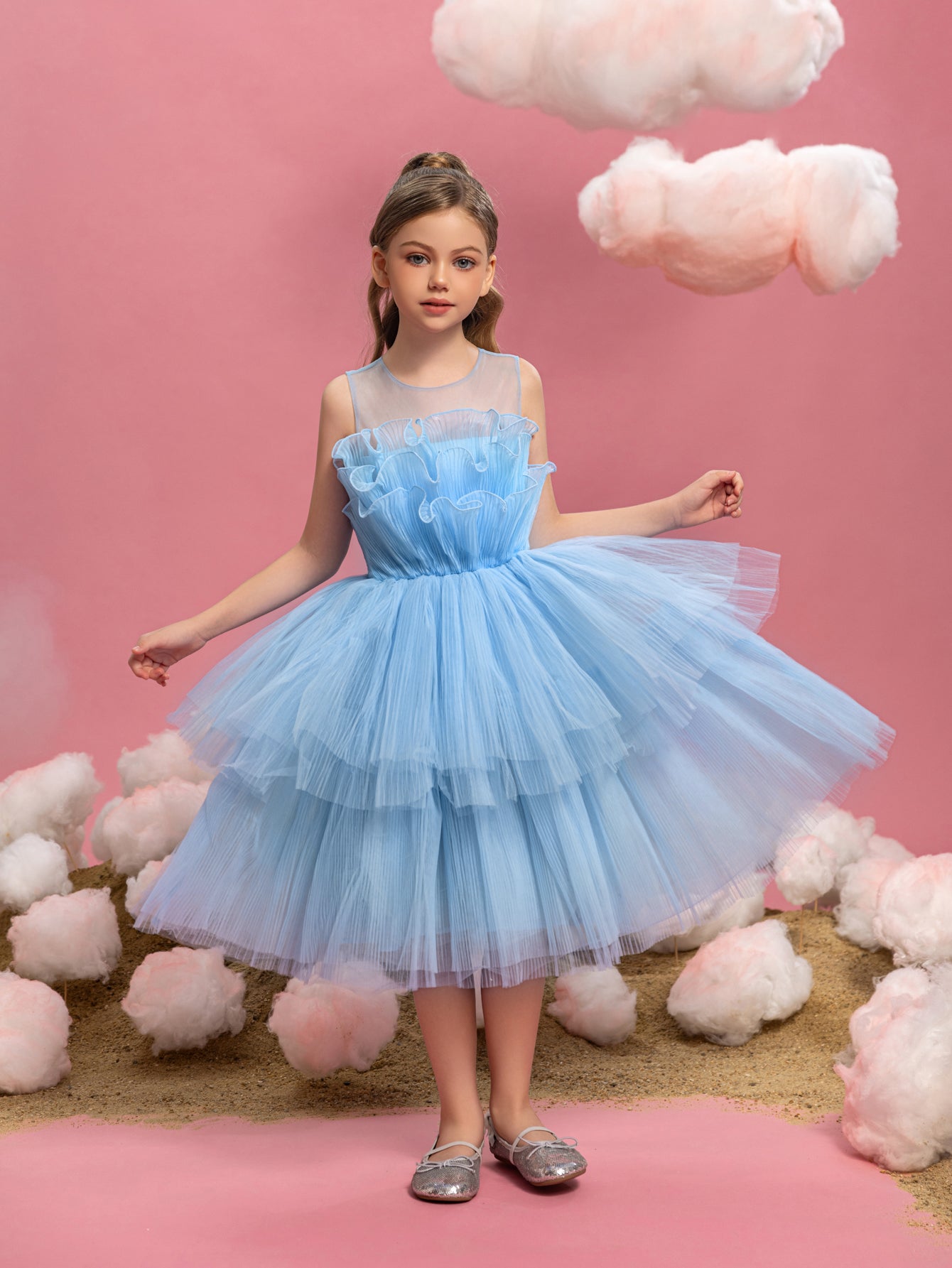 Wrapped in the serene hues of a clear sky, this dress captures the essence of a perfect summer day. The layered tulle skirt in soft blue creates a dreamy, floating effect, like gentle waves of the ocean or wisps of cloud against a morning sky. The sheer neckline is adorned with ruffle detailing that adds a touch of whimsy, reminiscent of delicate sea foam. This dress is perfect for a variety of special occasions, from garden parties to weddings, where the dress code calls for something as light and refreshing as a gentle breeze. It's a piece that celebrates the joy of being young and free-spirited, ensuring she'll feel every bit the carefree princess she is.