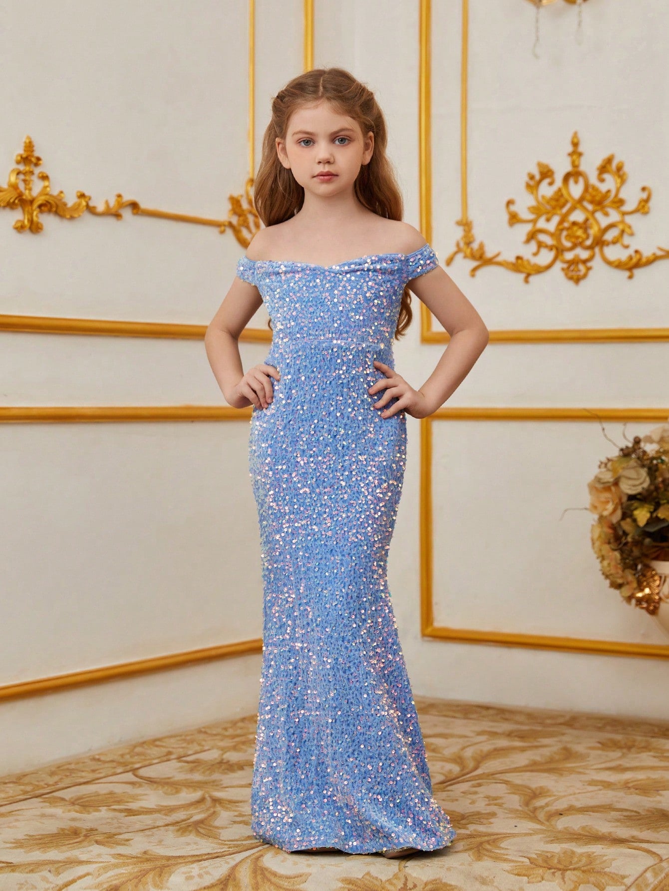 Capture the essence of elegance and charm with our stunning children's gown, perfect for making a memorable impression at any special occasion. The gown features an off-shoulder neckline that exudes sophistication and a figure-flattering silhouette that flows gracefully to the floor. Adorned with intricate sequins, this dress shimmers with every movement, creating a magical and enchanting effect.
