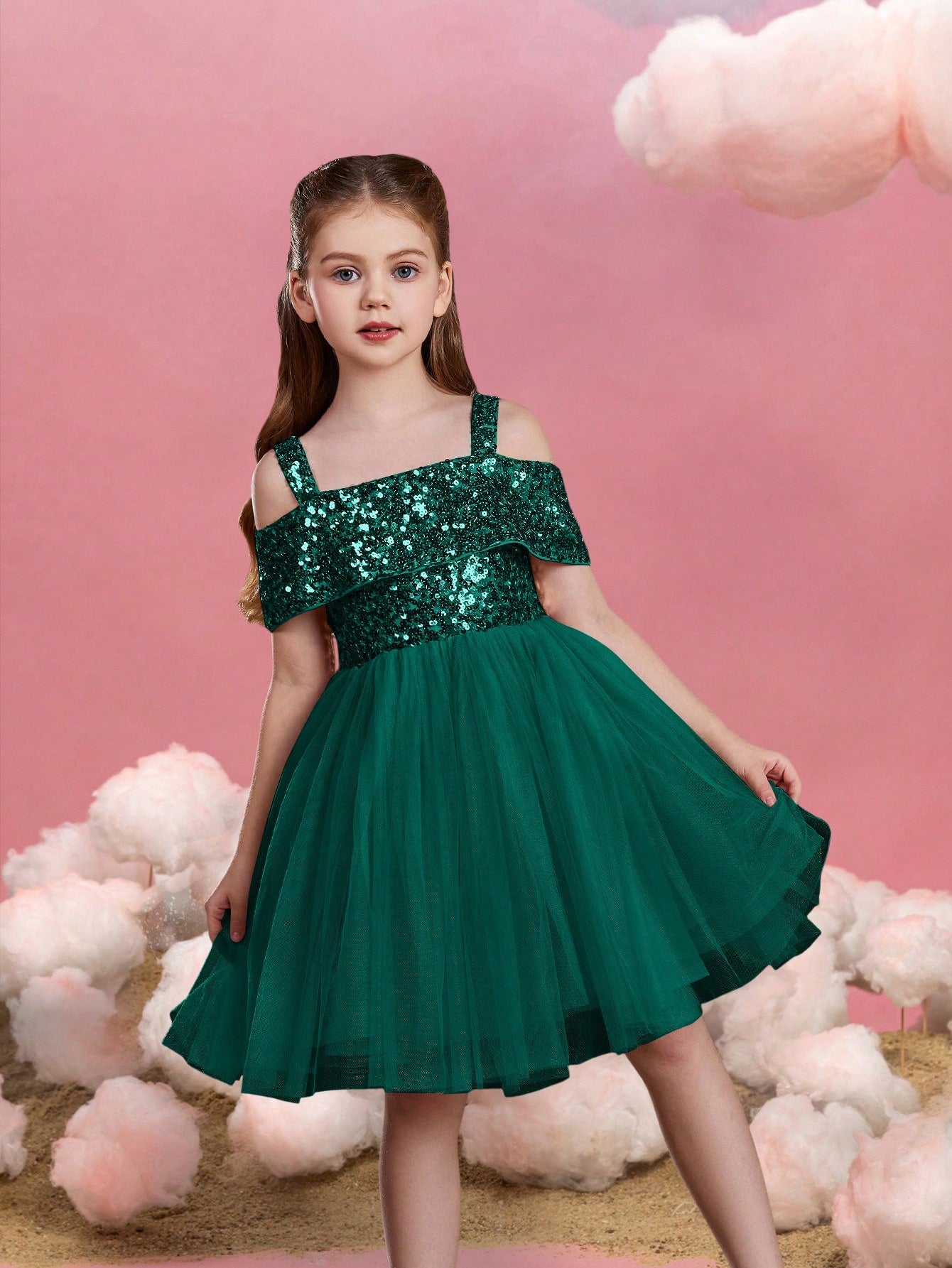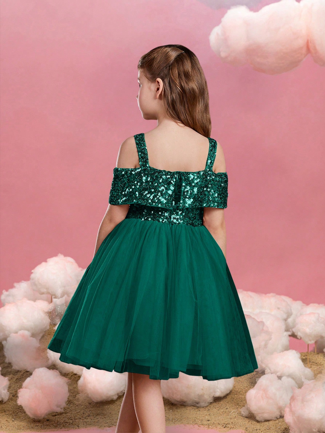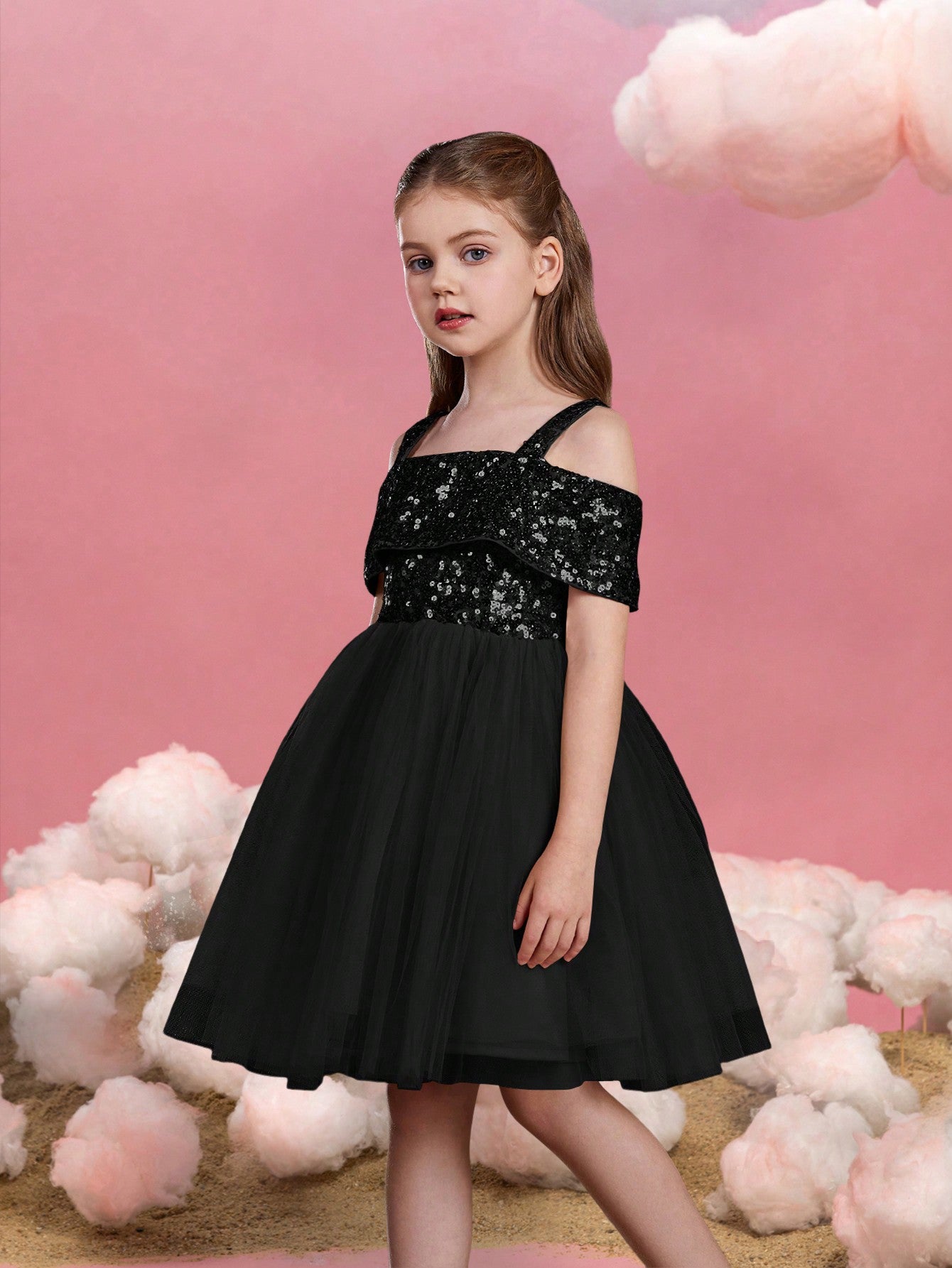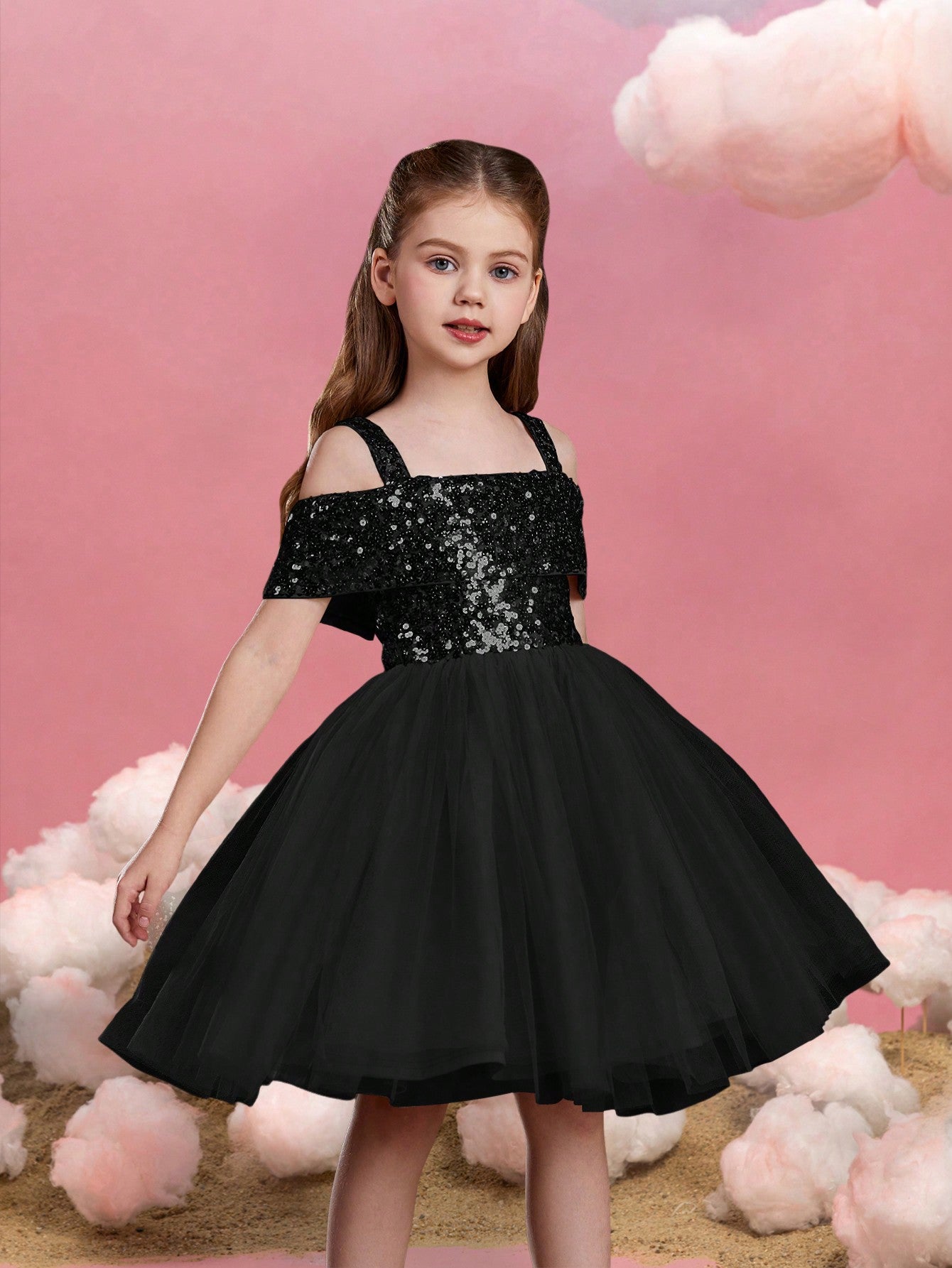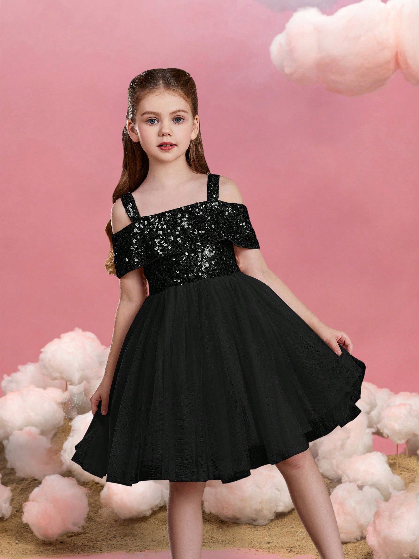 Let your little one sparkle in this enchanting sequin tulle dress. The bodice is adorned with glistening sequins, creating a dazzling effect that captures attention. Featuring an off-shoulder design with delicate straps, this dress combines style with comfort. The voluminous tulle skirt adds a whimsical touch, perfect for twirling and making magical moments. Ideal for parties, special events, and celebrations, this dress ensures she will shine bright like a star. Crafted with care, it offers a perfect blend of elegance and playfulness, making it a must-have for her wardrobe.