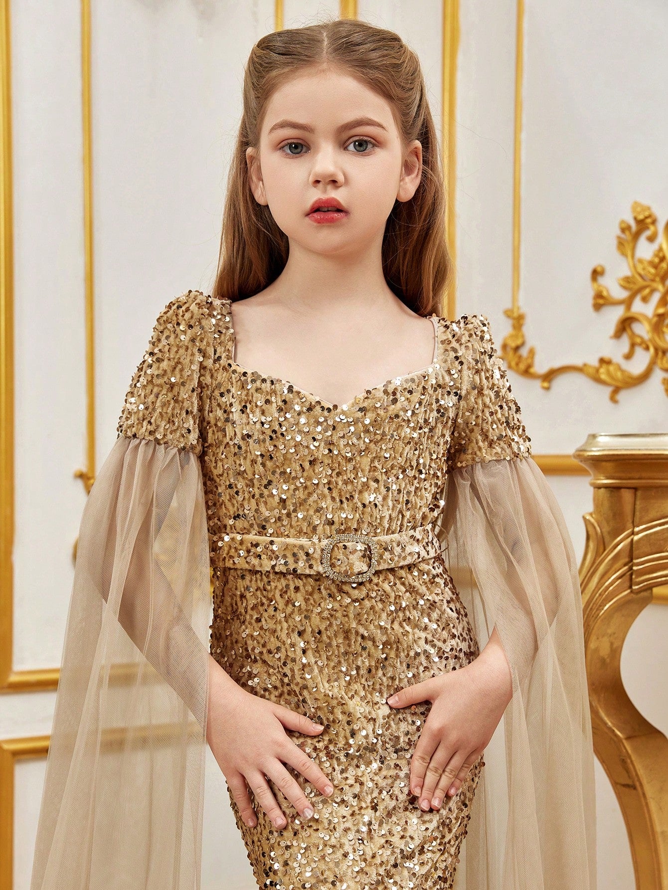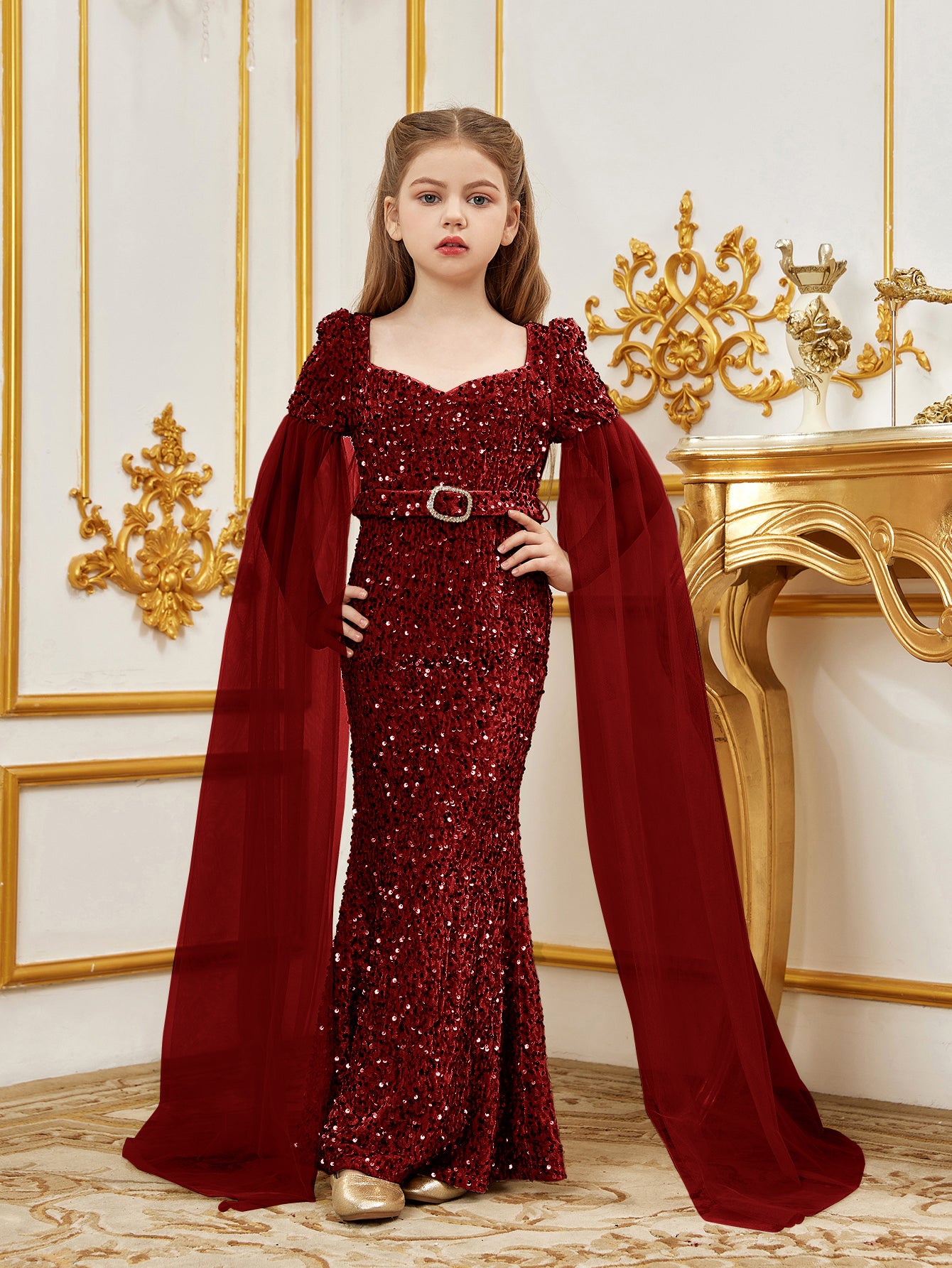 Elevate your little one's elegance with our stunning sequined mermaid gown, perfect for special occasions. The gown features a sweetheart neckline and a fitted silhouette, creating a regal look. The luxurious sequin fabric catches the light, while the flowing chiffon cape adds a touch of fairy-tale magic.