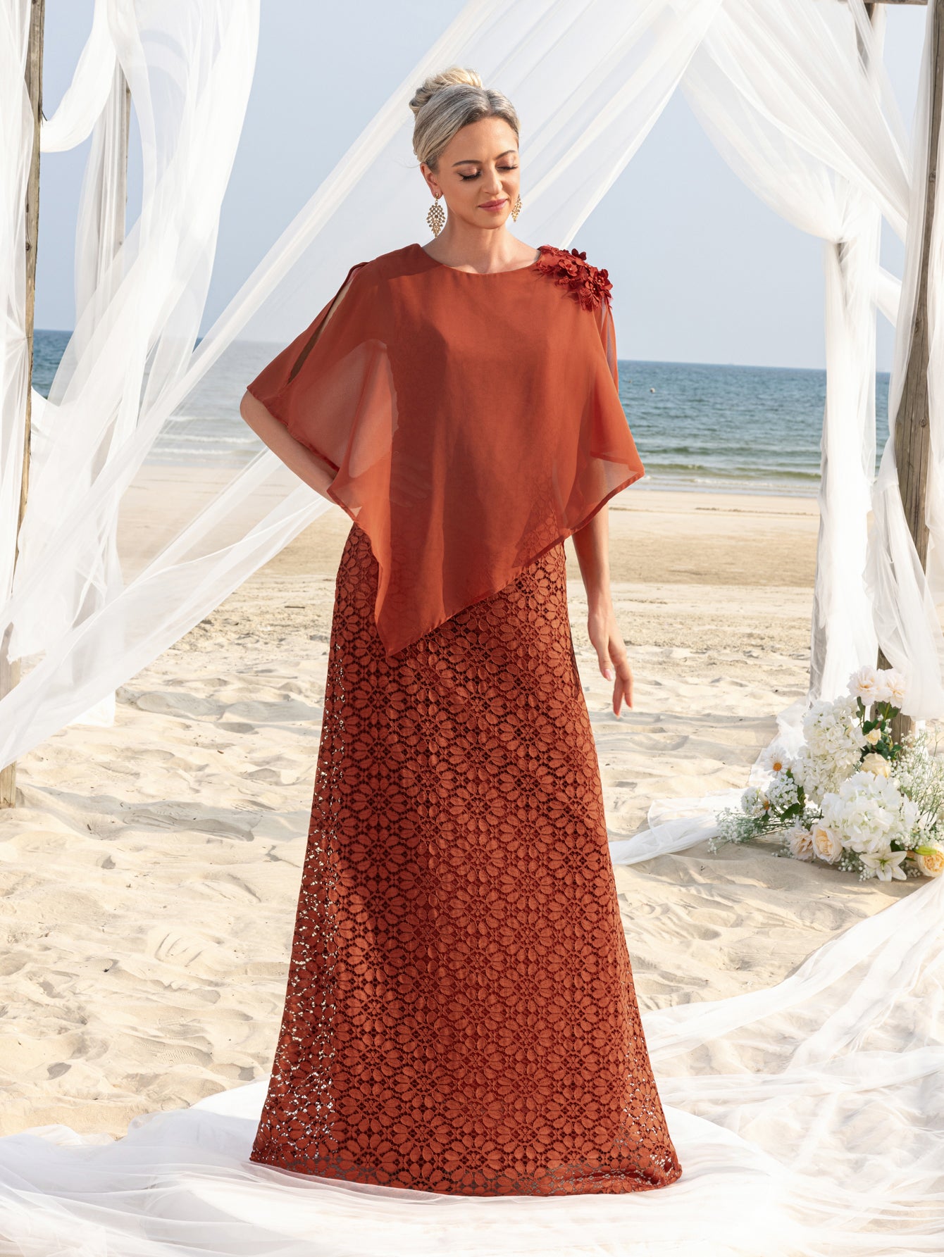 Make an elegant statement with our meticulously crafted mother-of-the-bride gown, designed to honor your pivotal role with grace and sophistication. The design features a one-shoulder silhouette flowing into a waterfall chiffon cape, artfully draped to skim the arms and back while creating dynamic movement. The empire waist sits comfortably above the natural waistline, elongating the torso and allowing effortless comfort for extended wear.