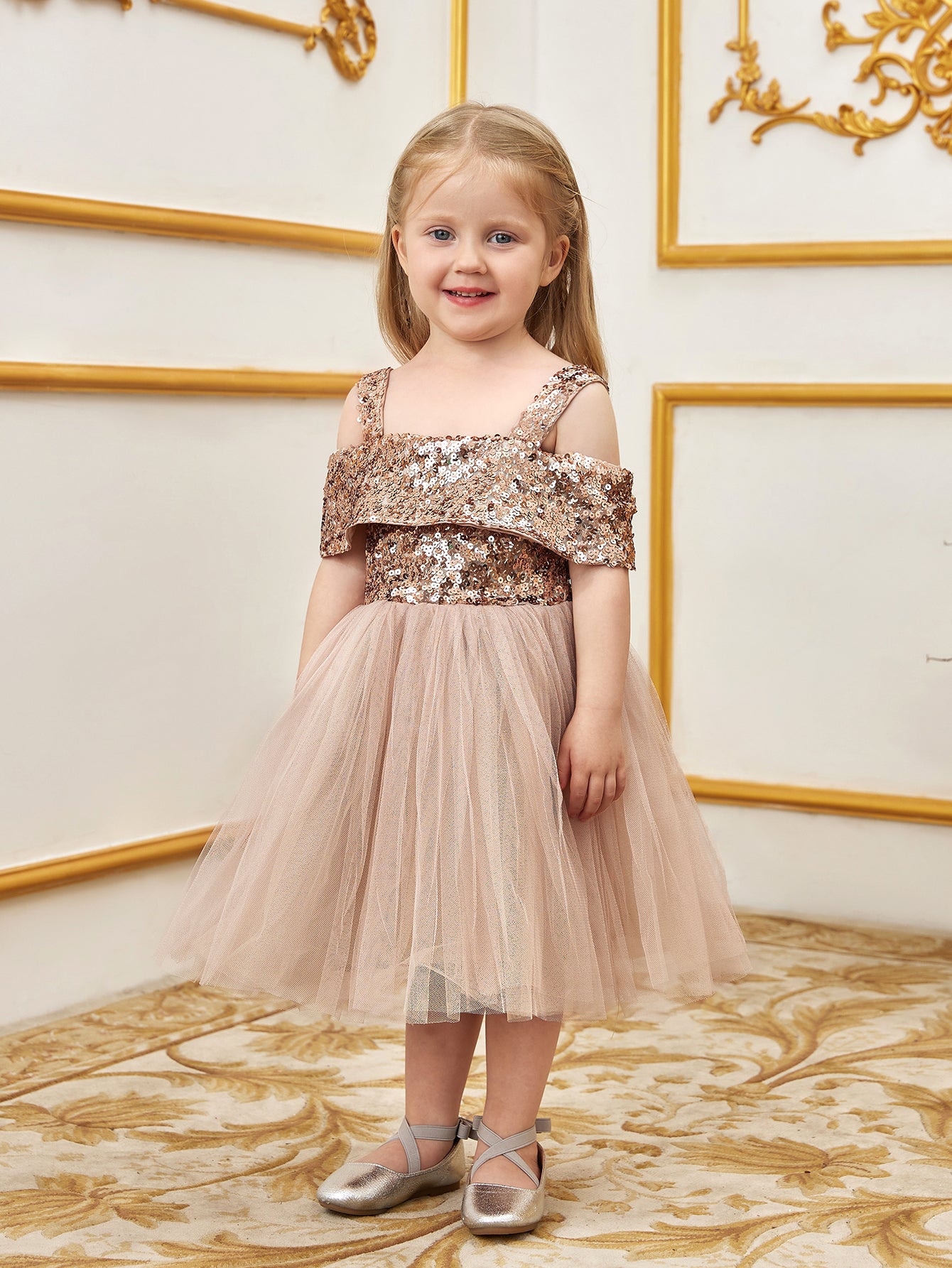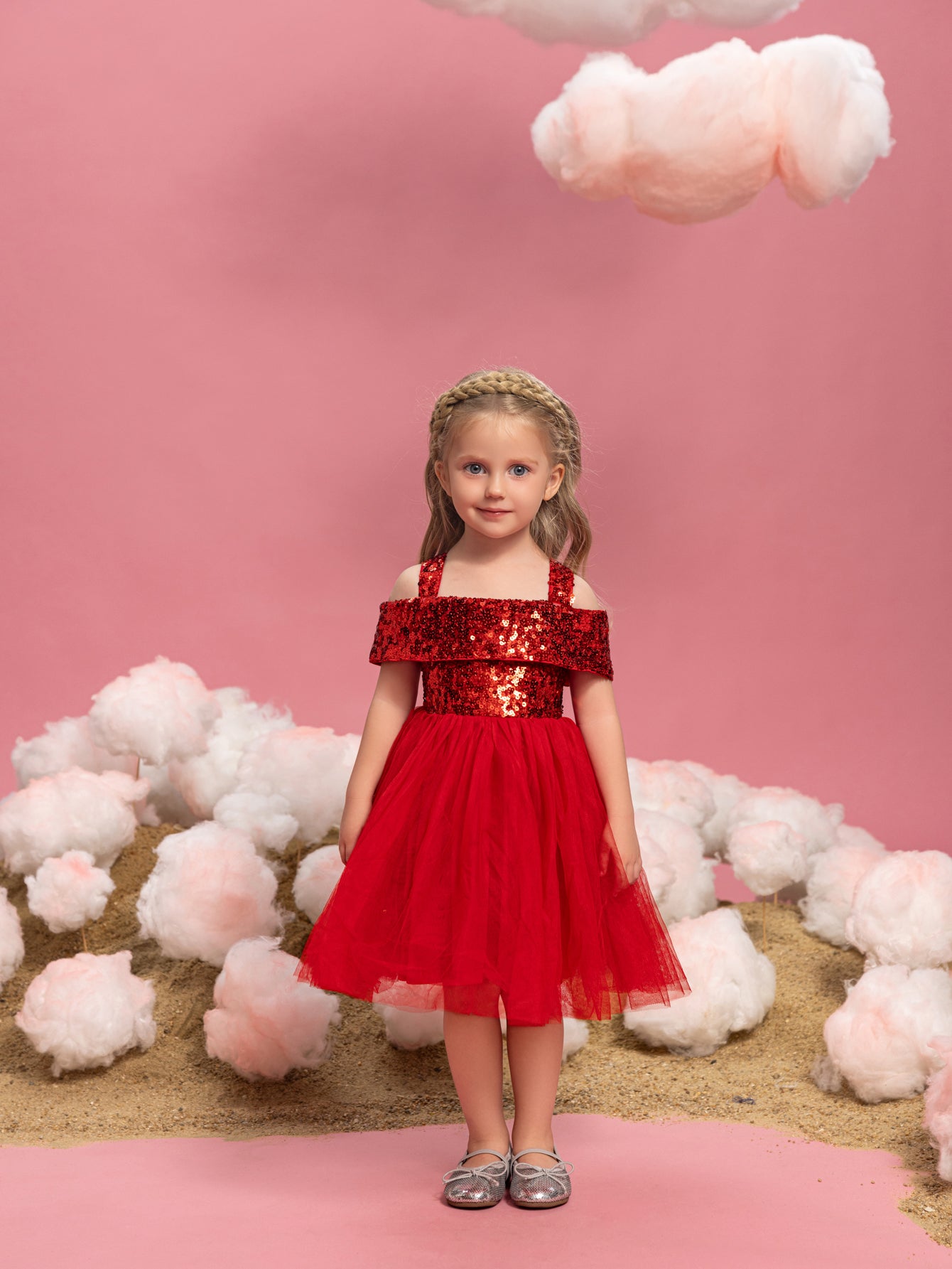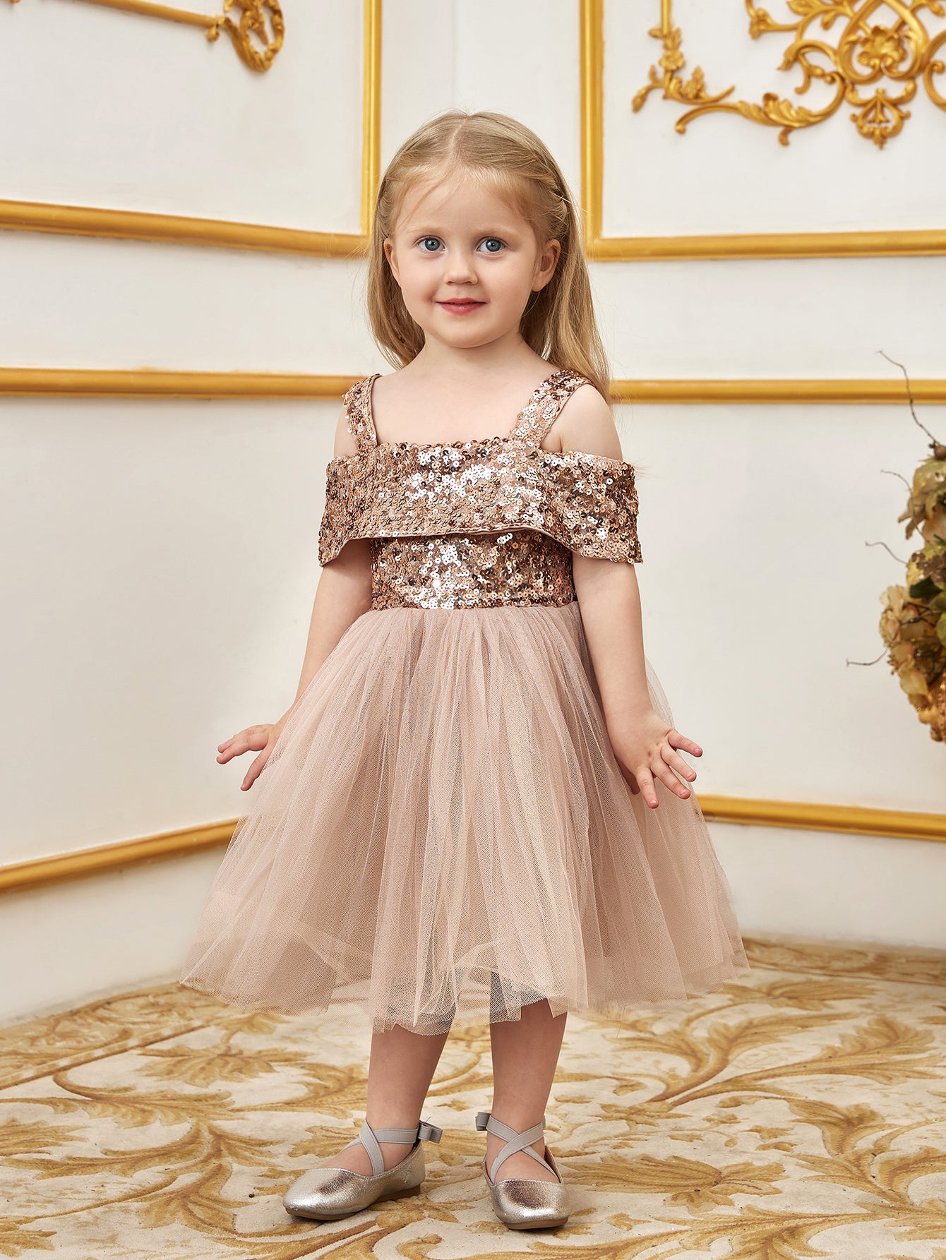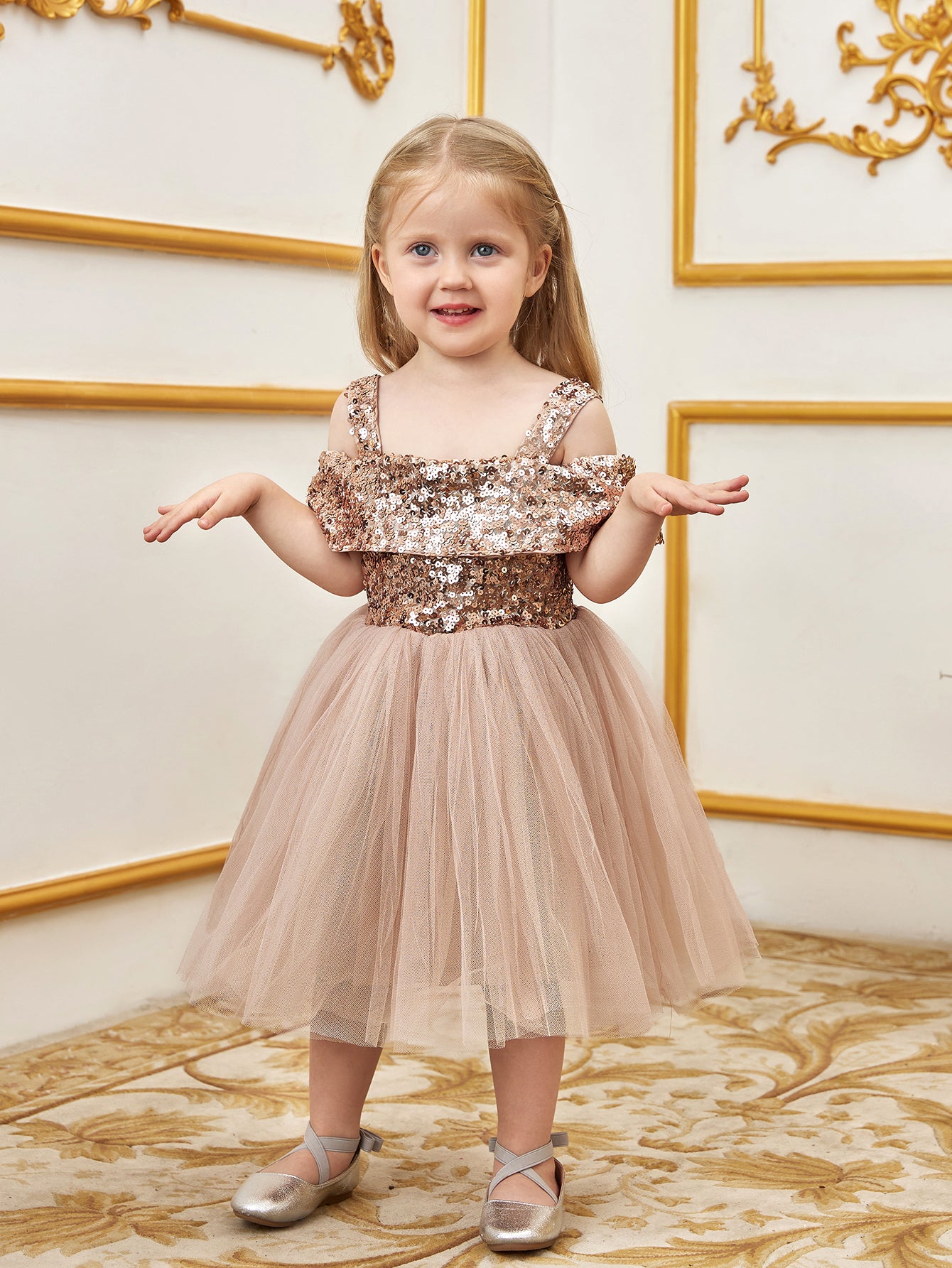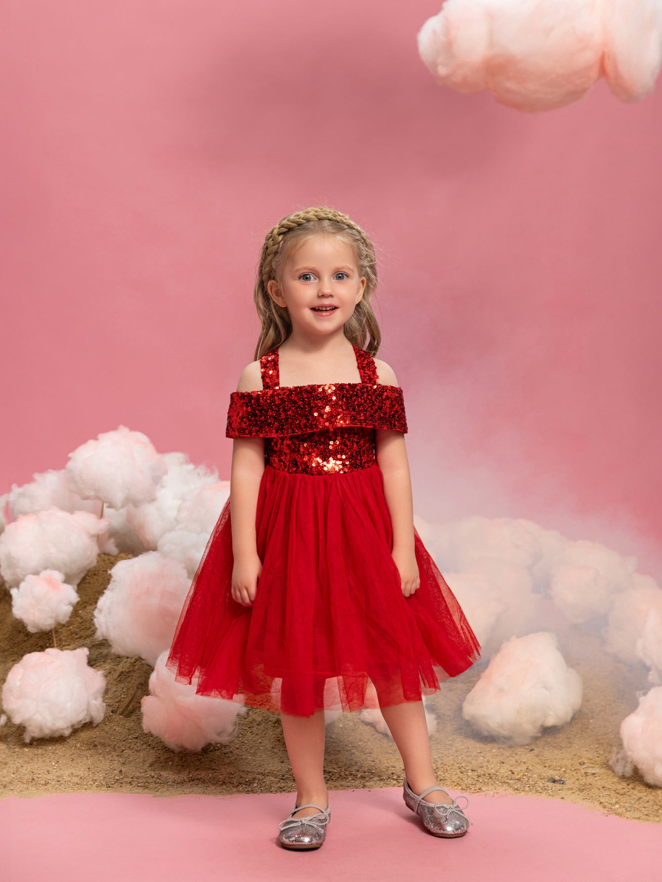 Let your little one sparkle in this enchanting sequin tulle dress. The bodice is adorned with glistening sequins, creating a dazzling effect that captures attention. Featuring an off-shoulder design with delicate straps, this dress combines style with comfort. The voluminous tulle skirt adds a whimsical touch, perfect for twirling and making magical moments. Ideal for parties, special events, and celebrations, this dress ensures she will shine bright like a star. Crafted with care, it offers a perfect blend of elegance and playfulness, making it a must-have for her wardrobe.